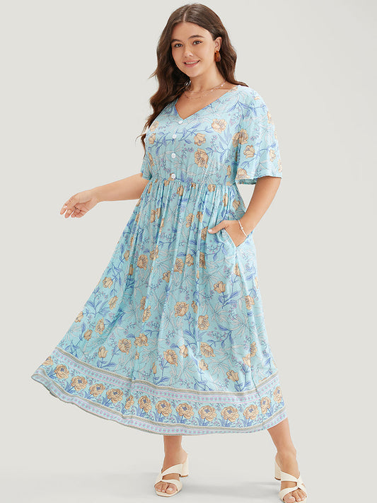 Bandana Print Button Detail Pocket Flutter Shirred Dress