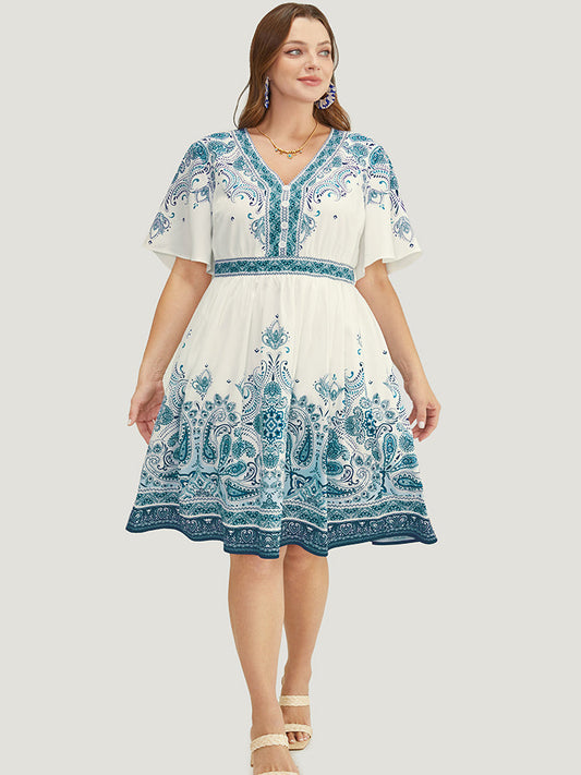 Bandana Print Button Detail Pocket Ruffle Sleeve Dress