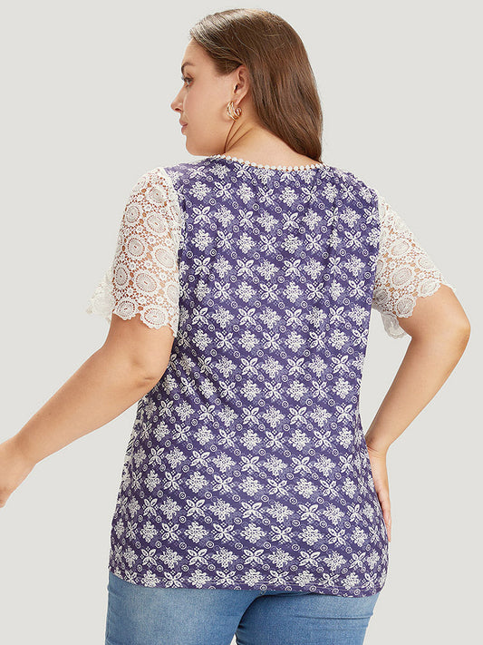 Bandana Print Lace Patchwork Pompom Trim T-shirt