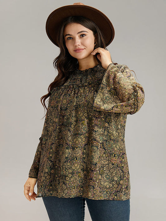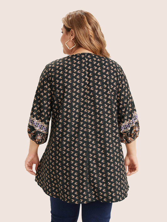 Bandana Print Notched Collar Lantern Sleeve Blouse