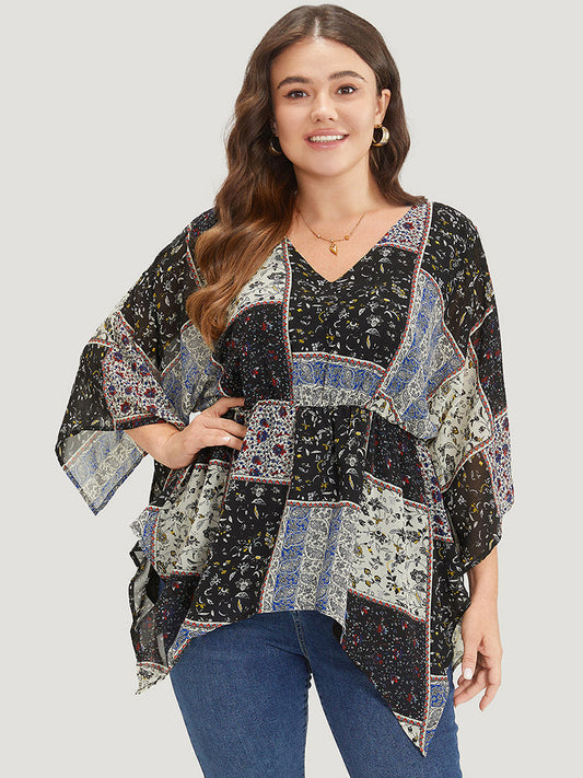Bandana Print Patchwork Asymmetrical Hem Batwing Sleeve Blouse