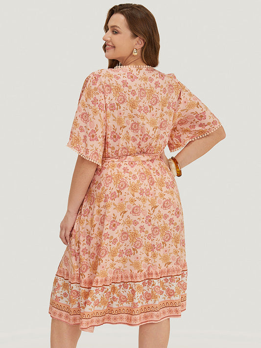 Bandana Print Pompom Trim Pocket Flutter Belted Wrap Dress