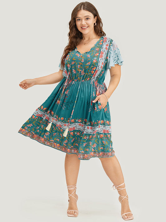 Bandana Print Ruffle Sleeve Pocket Tie Neck Tassels Dress