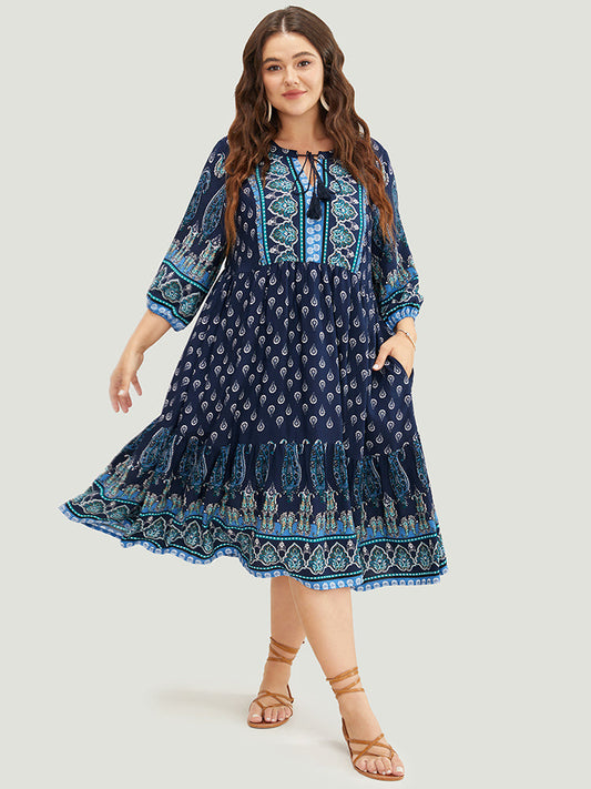 Bandana Print Ruffles Lantern Sleeve Pocket Tassels Tie Neck Dress