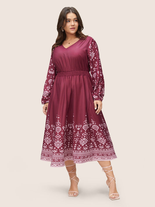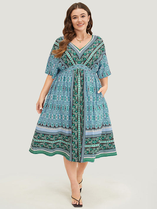Bandana Print Shirred Pocket Dolman Sleeve Midi Dress