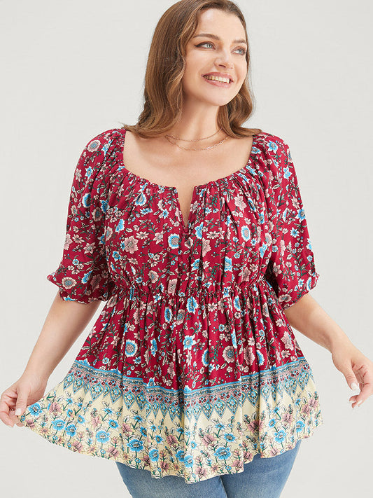 Bandana Puff Sleeve Notched Square Neck Ruffles Blouse