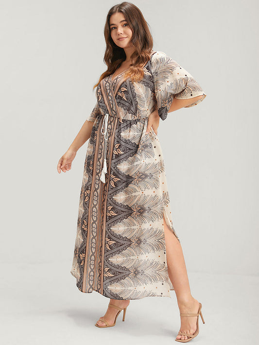 Bandana Ruffles Sleeve Pocket Tassels Ties Up Surplice Neck Dress