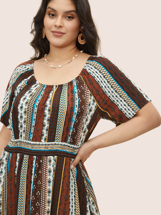 Bandana Striped Shirred Ruffle Cap Sleeve Dress