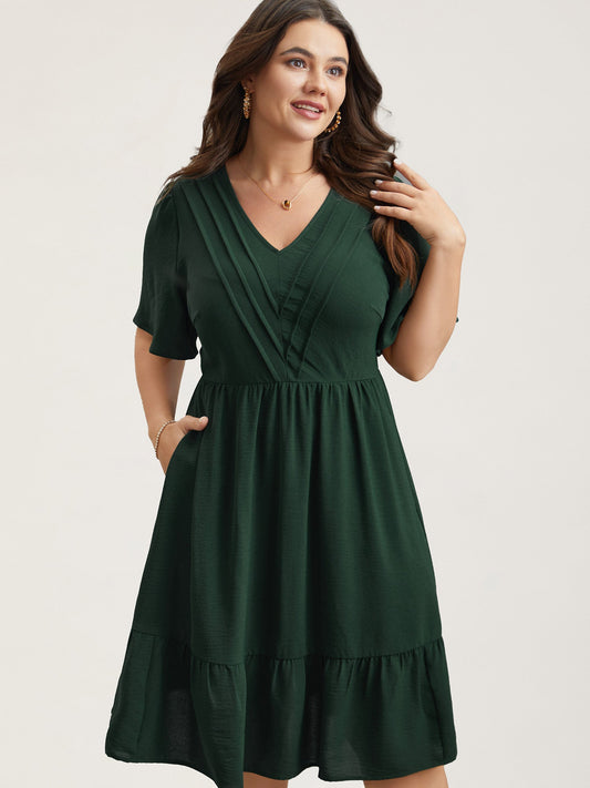 Bib-Front V-Neck Pockets Tiered Midi Dress