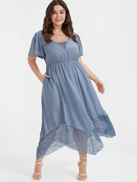 Bloom Dress - Solid Lace Asymmetrical Hem Ruffled Pocket Midi Dress