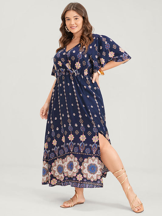 Bloom Dress -Bandana Embroidered Ruffles V Neck Midi Dress