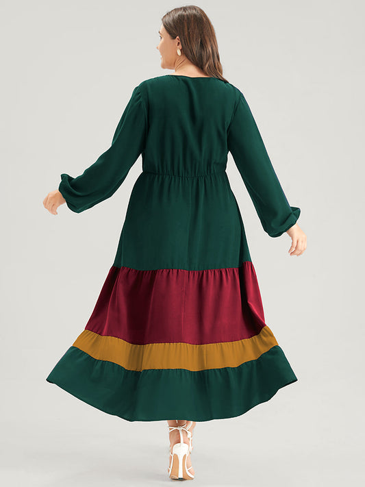 Bloom Dress -Colorblock Contrast Pocket Lantern Sleeve Flutter Surplice Neck Maxi Dress