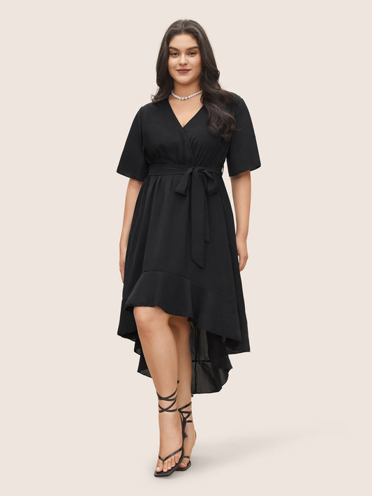 Bloom Dress - Solid Tie Surplice Ruffle High Low Dress