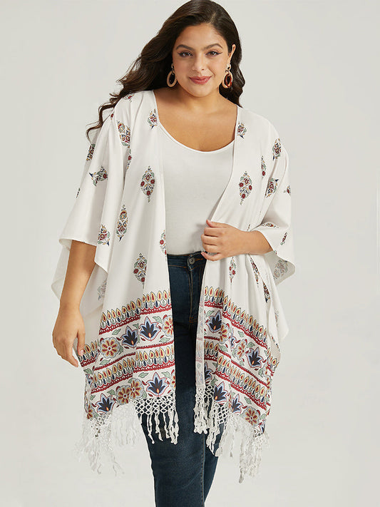 Boho Print Asymmetrical Hem Tassel Trim Drape Kimono