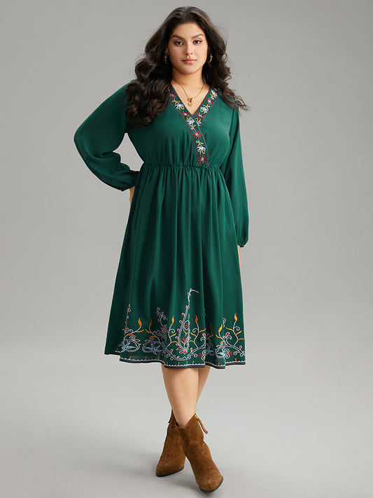 Boho Print Embroidered Wrap Lantern Sleeve Dress