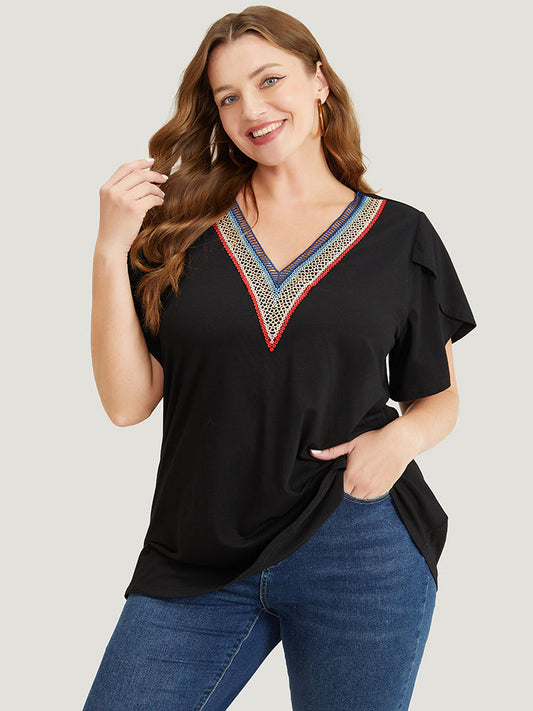 Plain Guipure Lace Notched Gathered Flutter Sleeve T-shirt
