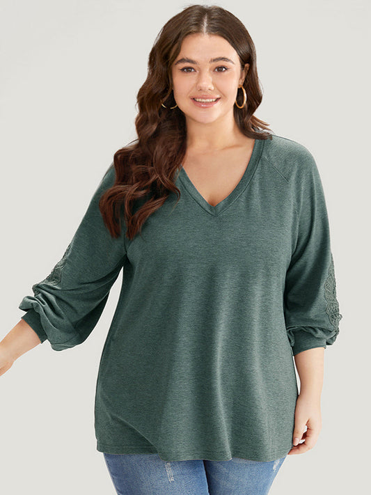 Plain Guipure Lace V Neck Raglan Sleeve Sweatshirt