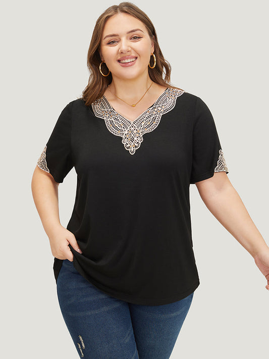 Plain Guipure Lace Notched Roll Batwing Sleeve T-shirt