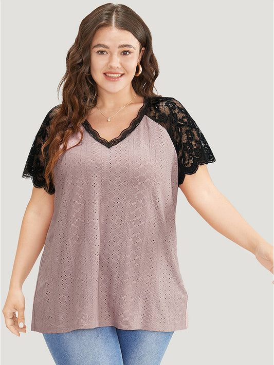 Plain Lace Raglan Sleeve Broderie Anglaise Scalloped Trim T-shirt