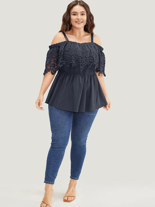 Plain Lace Trim Ruffle Hem Cold Shoulder Blouse