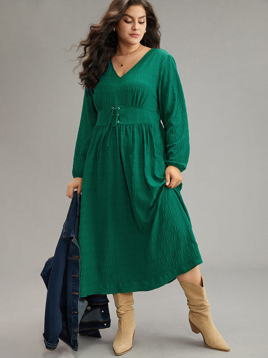 Plain Lace Up Shirred Pocket Round Neck Dress