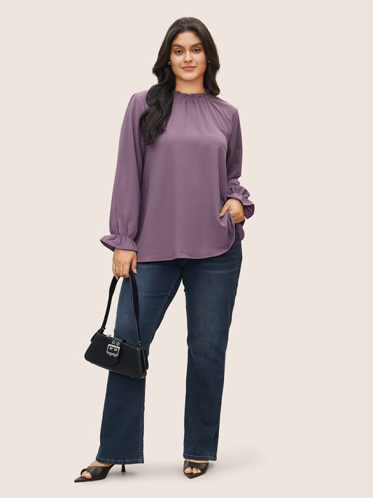Plain Lantern Sleeve Ruffle Trim Mock Neck Blouse