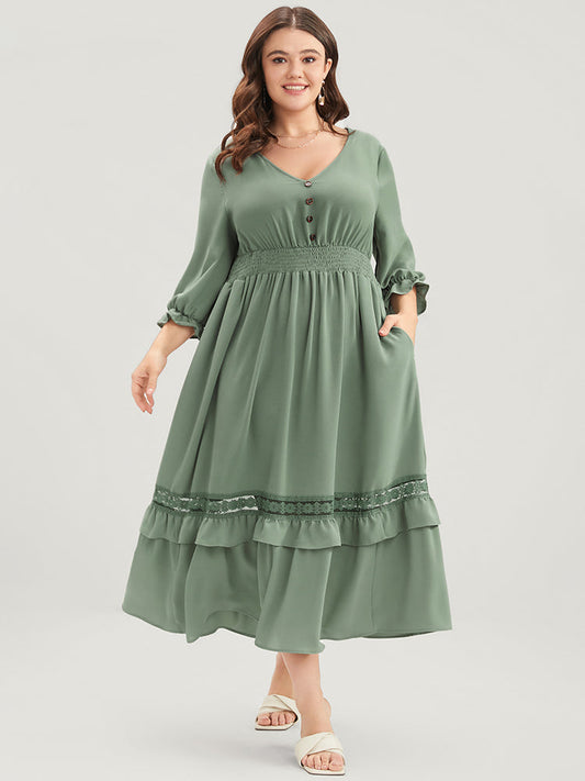 Plain Lantern Sleeve Button Detail Pocket Contrast Lace Dress