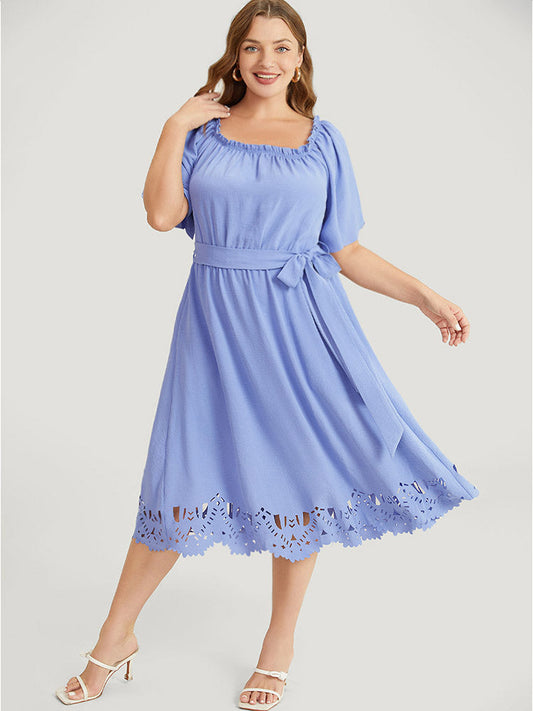 Plain Laser Cut Gathered Pocket Scalloped Trim Knee Dress