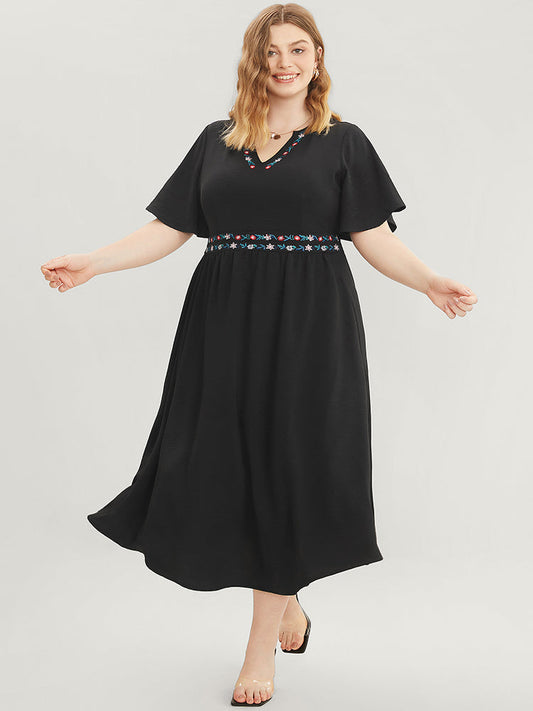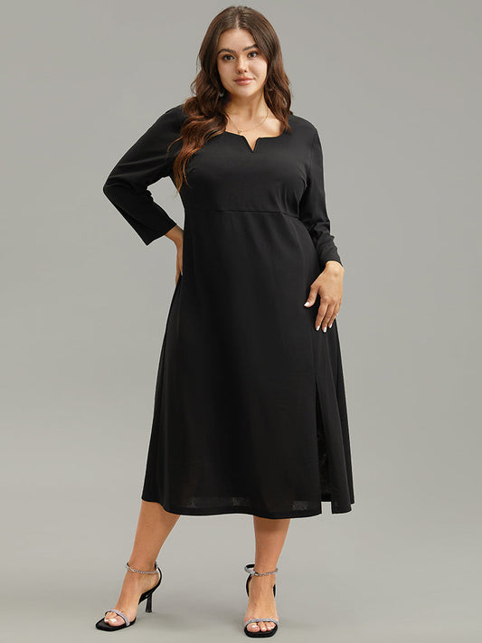 Plain Notched Neck Embroidered Pocket Split Flutter Dress