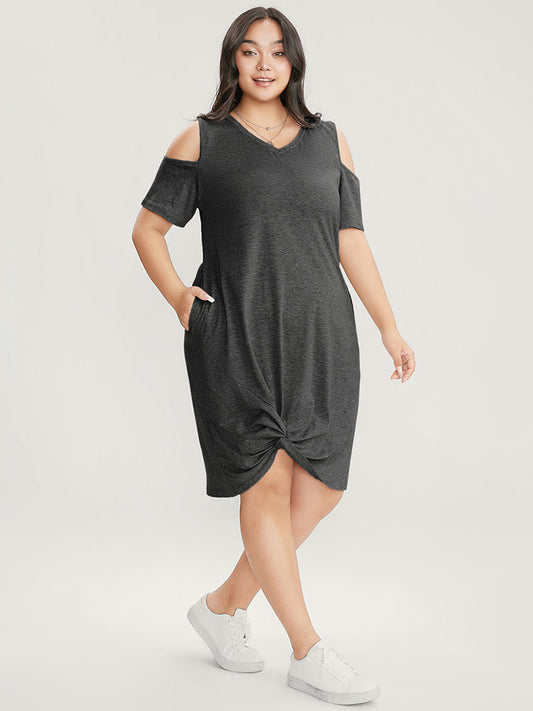 Plain Pocket Twist Cold Shoulder Asymmetrical Hem Dress