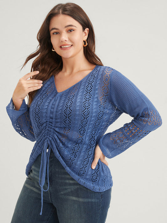 Plain Pointelle Knit V Neck Crochet Drawstring Knit Top