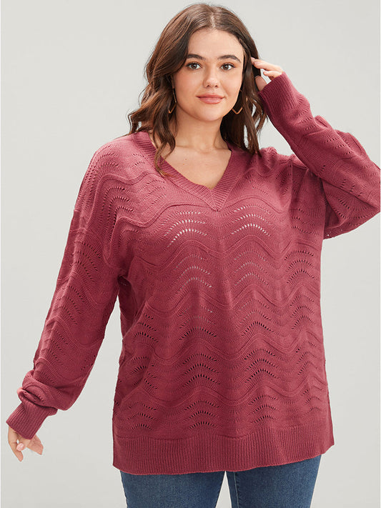 Plain Pointelle Knit V Neck Eyelet Loose Knit Top
