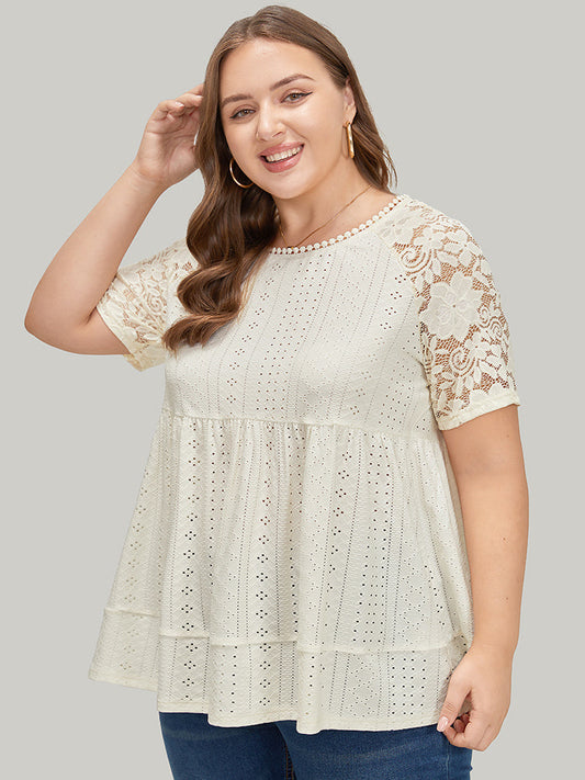 Plain Pompom Trim Lace Sleeve Broderie Anglaise T-shirt