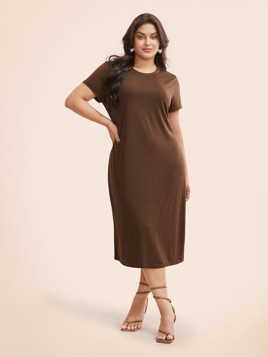 Plain Round Neck Pocket Button Detail Flutter Midi Dress