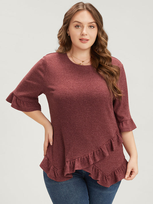 Plain Ruffle Trim Asymmetrical Hem Rib Knit Tee