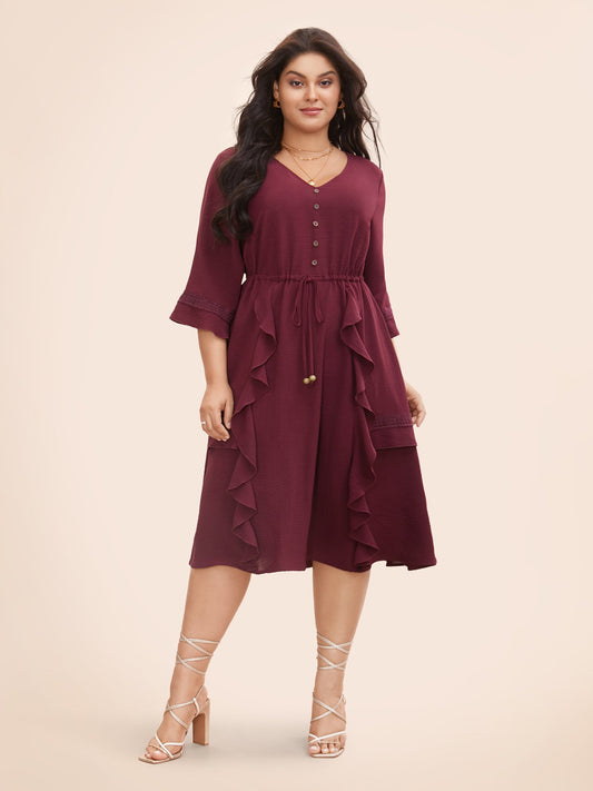 Plain Ruffle Trim Button Detail Drawstring Dress