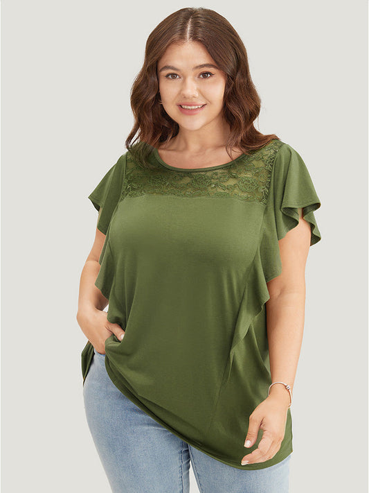 Plain Ruffle Trim Cap Sleeve Lace Insert T-shirt
