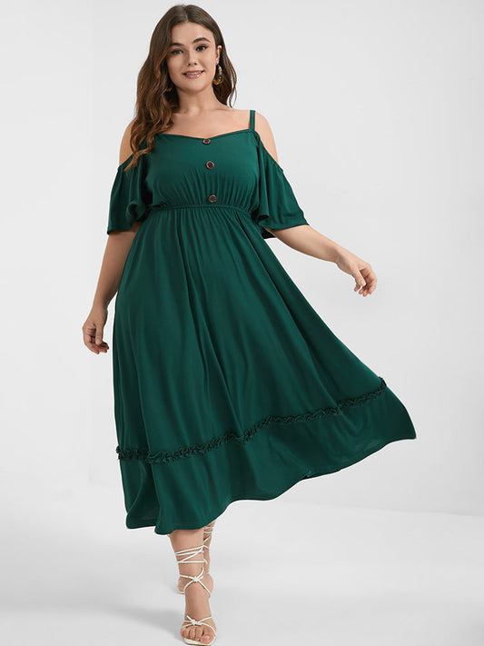 Plain Ruffles Button Cold Shoulder Midi Dress
