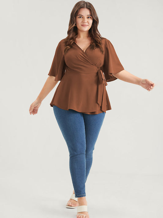 Plain Ruffles Button Belted Wrap Babydoll Blouse