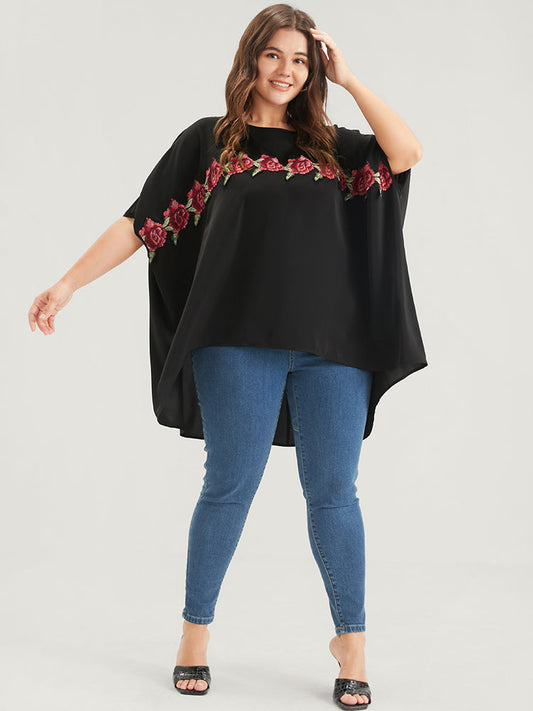 Plain Ruffles Asymmetrical Hem Dolman Sleeve Embroidered Blouse