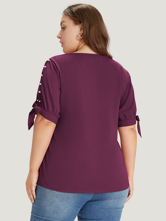 Plain Scalloped Trim Pearl Beaded Knot Sleeve Blouse