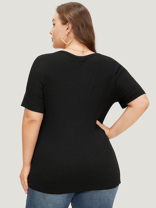 Plain Scoop Neck Button Through Rib Knit T-shirt