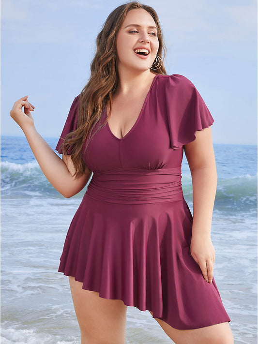 Plain Sculpt Waist Split Hem Ruffles Ruched Swim Dress