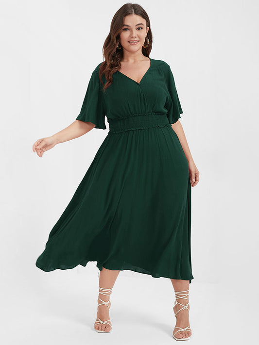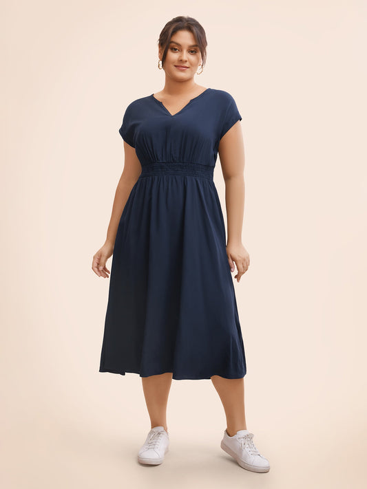 Plain Shirred Button Elastic Waist Ruffles Midi Dress
