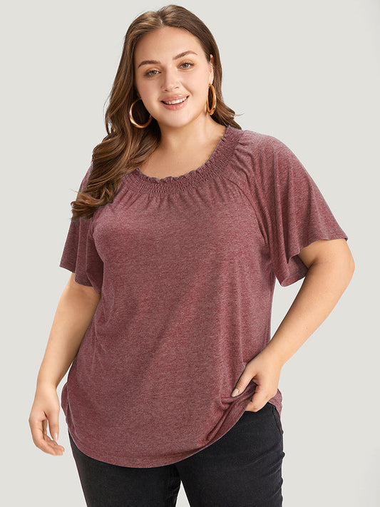 Plain Shirred Crew Neck Flutter Sleeve T-shirt