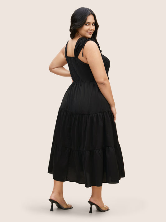 Plain Shirred Drawstring Ruffle Layered Hem Dress