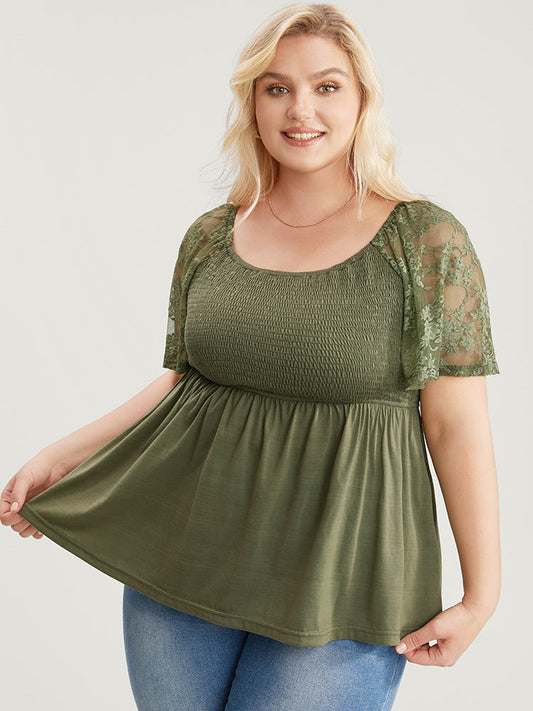 Plain Shirred Lace Ruffles Sleeve T-shirt