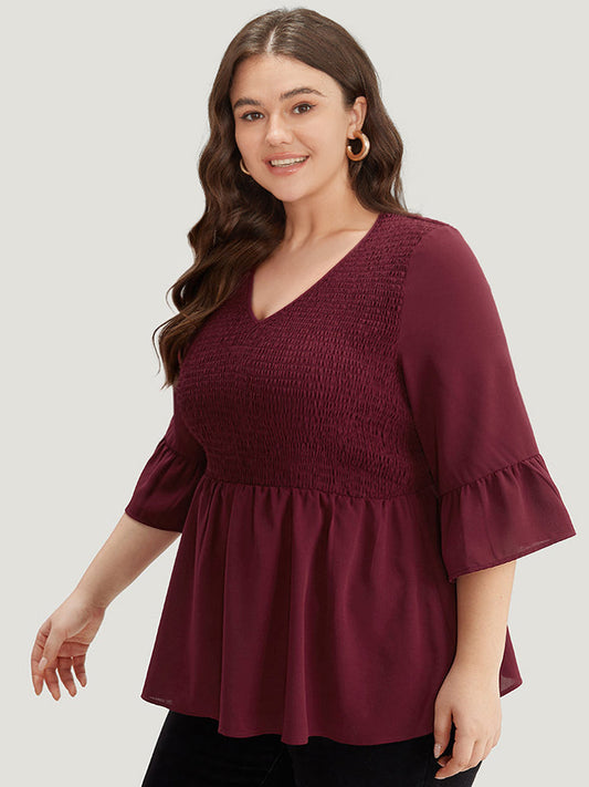 Plain Shirred Patchwork Ruffle Trim V Neck Blouse