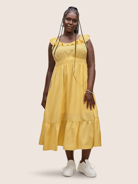 Plain Shirred Ruffle Trim Sleeveless Dress