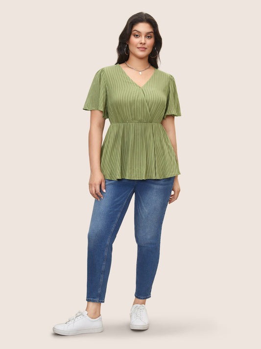 Plain Striped Overlap Collar Ruffle Sleeve Blouse
